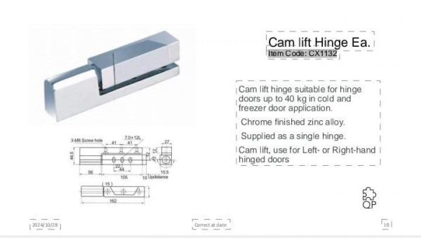 Cam lift hinge suitable for hinge doors up to 40kg in cold and freezer door application.